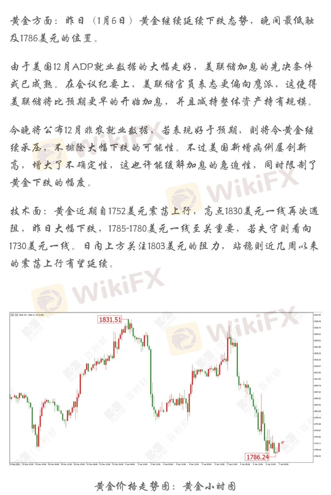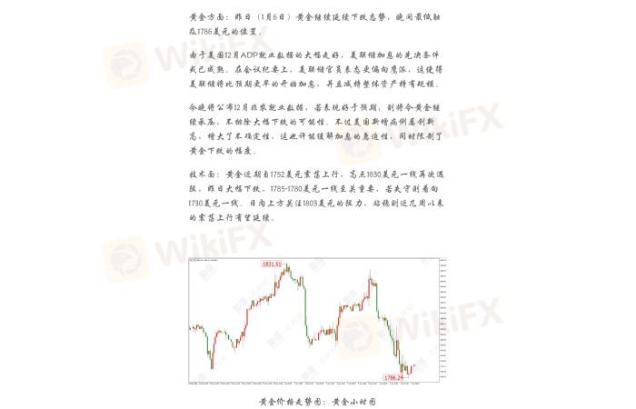 黄金方面:昨日(1月6日)黄金继续延续下跌态势,晚间最低触及1786美元的位置。