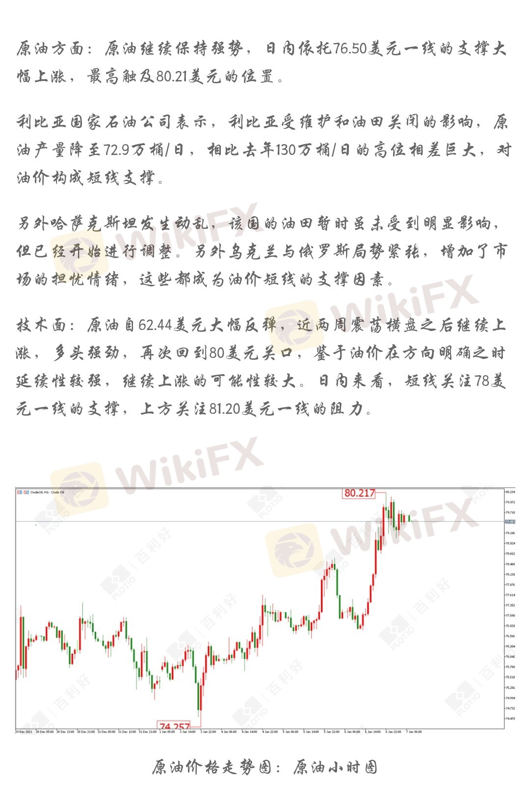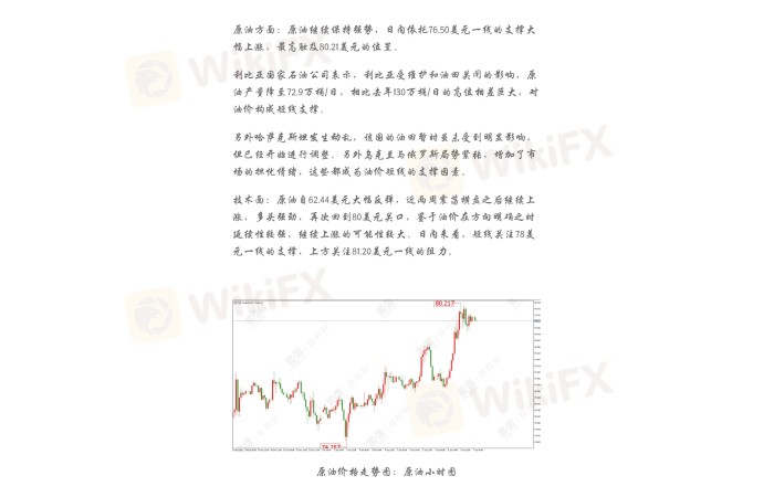 原油方面:原油继续保持强势,日内依托76.50美元一线的支撑大幅上涨,最高触及80.21美元的位置。