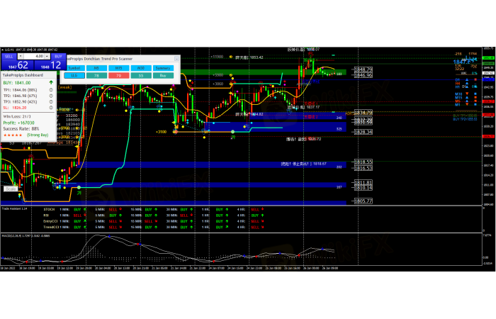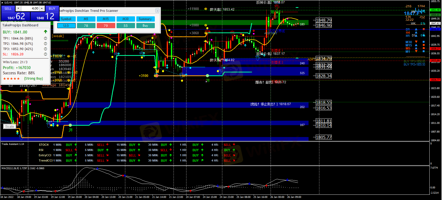 金价周二收盘位于一年来的阻力线(1846美元/盎司附近)上方,令黄金多头对金价进一步涨向2021年11月高点1877美元/盎司充满希望。目前1846美元/盎司已经构成支撑。