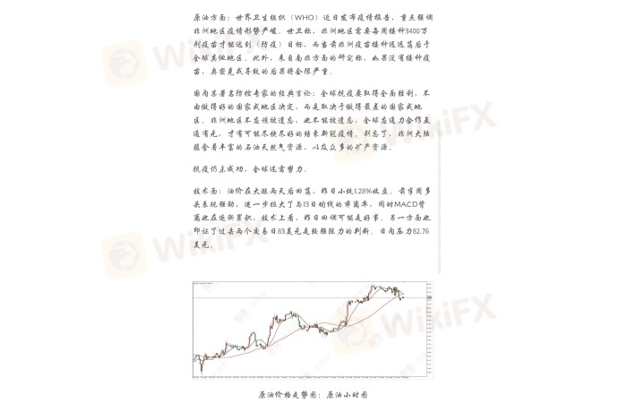 技术面:油价在大涨两天后回落,昨日小跌1.28%收盘。前半周多头表现强劲,进一步拉大了与13日均线的乖离率,同时MACD背离也在逐渐累积,技术上看,昨日回调可能是好事。另一方面也印证了过去两个交易日83美元是较强阻力的判断。日内压力82.76美元。