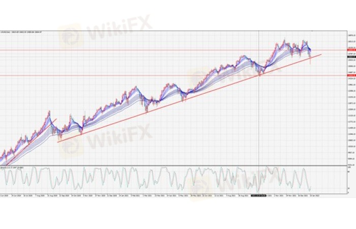 周一,纳斯达克100指数先抑后扬,一度跌近3%,长下影线微幅收阳。日线图,美国股市长期慢牛,期间伴随波段性快速调整。过去两个月,纳指在16000上下500点左右的区间高位震荡。周一盘中跌穿上涨趋势线,近两周的技术性熊市继续扩大的概率较大。