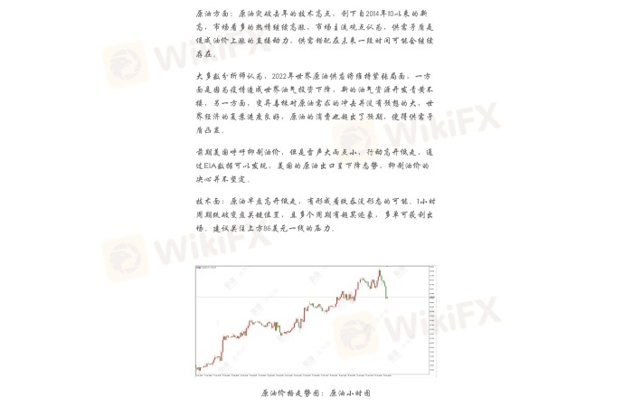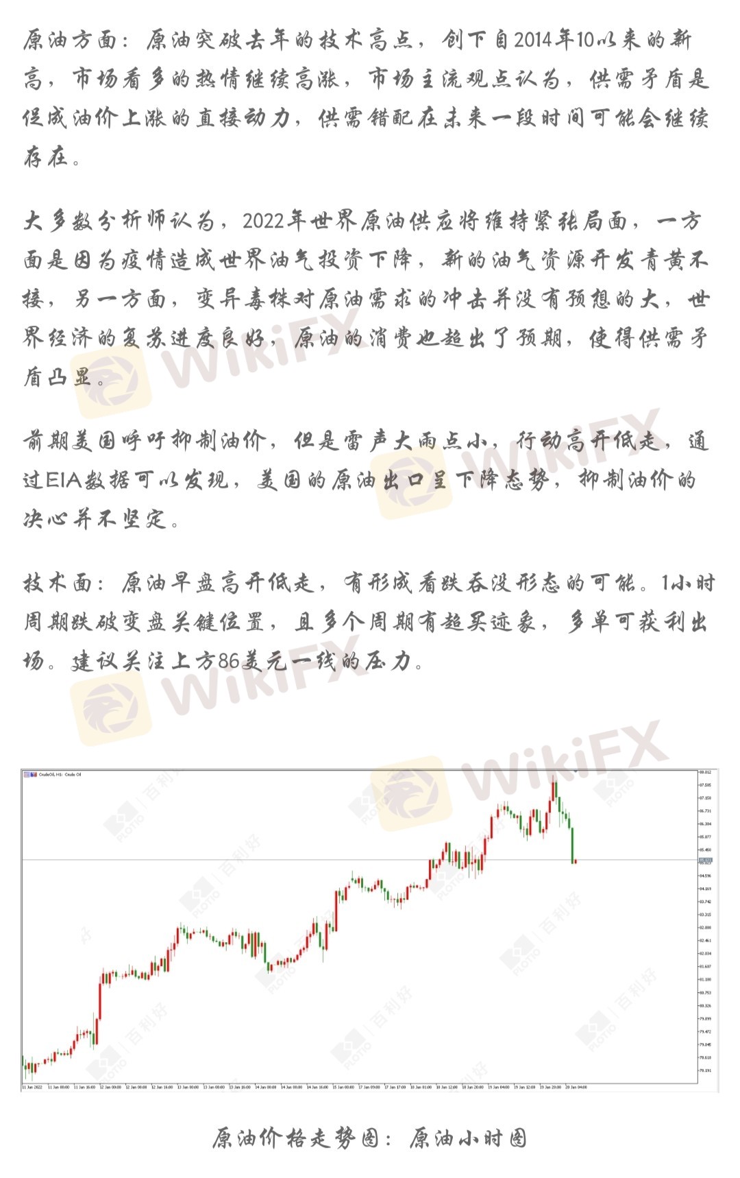 技术面:原油早盘高开低走,有形成看跌吞没形态的可能。1小时周期跌破变盘关键位置,且多个周期有超买迹象,多单可获利出场。建议关注上方86美元一线的压力。