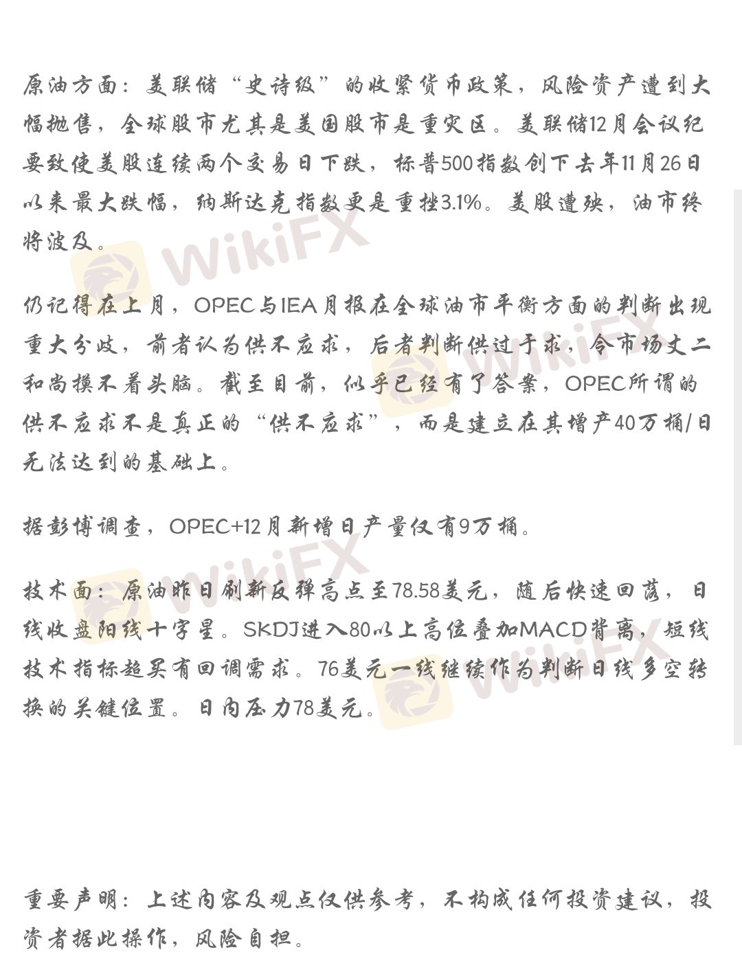 原油方面:美联储“史诗级”的收紧货币政策,风险资产遭到大幅抛售,全球股市尤其是美国股市是重灾区。美联储12月会议纪要致使美股连续两个交易日下跌,标普500指数创下去年11月26日以来最大跌幅,纳斯达克指数更是重挫3.1%。美股遭殃,油市终将波及。
