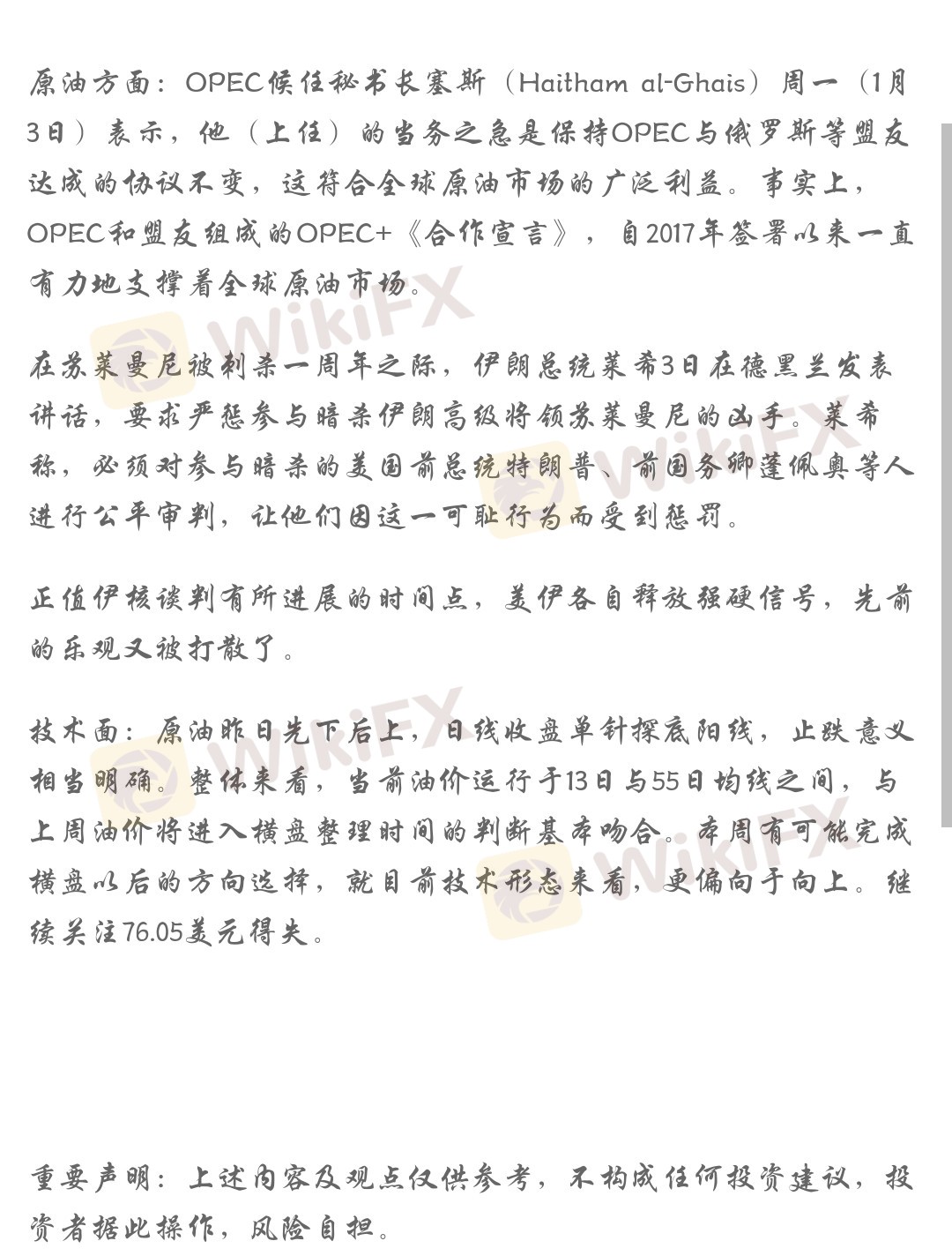 原油方面:OPEC候任秘书长塞斯(Haitham al-Ghais)周一(1月3日)表示,他(上任)的当务之急是保持OPEC与俄罗斯等盟友达成的协议不变,这符合全球原油市场的广泛利益。事实上,OPEC和盟友组成的OPEC+《合作宣言》,自2017年签署以来一直有力地支撑着全球原油市场。
