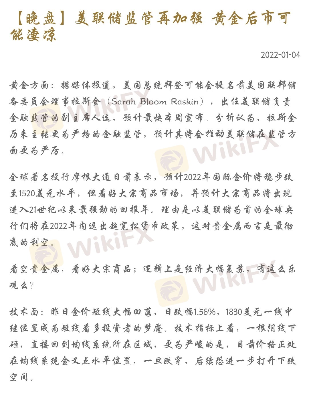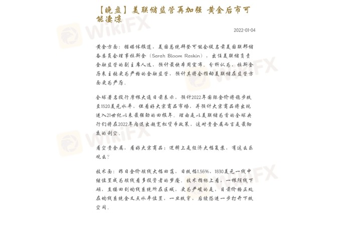 【晚盘】美联储监管再加强 黄金后市可能凄凉