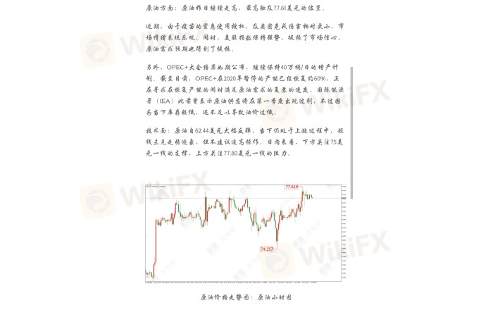 技术面:原油自62.44美元大幅反弹,当下仍处于上涨过程中,短线未见走弱迹象,但不建议追高操作。日内来看,下方关注75美元一线的支撑,上方关注77.80美元一线的阻力。