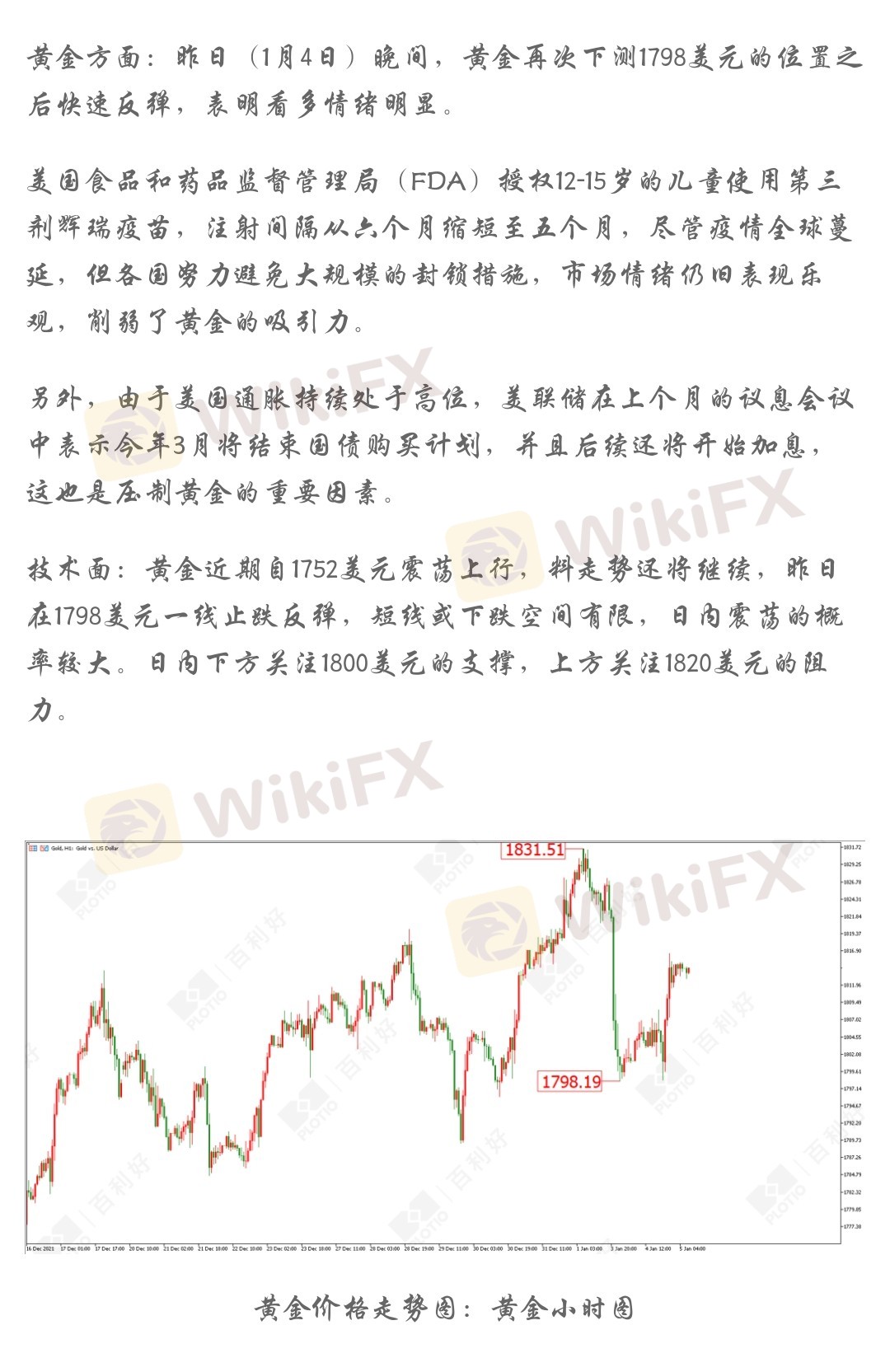 黄金方面:昨日(1月4日)晚间,黄金再次下测1798美元的位置之后快速反弹,表明看多情绪明显。