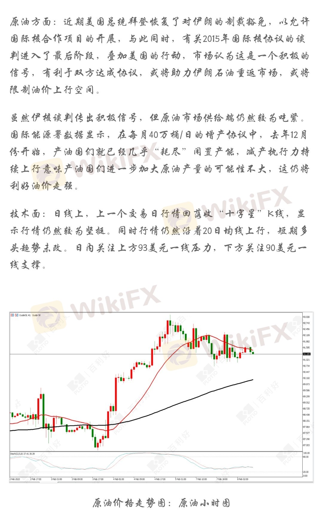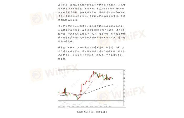 技术面:日线上,上一个交易日行情回落收“十字星”K线,显示行情仍然较为坚挺。同时行情仍然沿着20日均线上行,短期多头趋势未改。日内关注上方93美元一线压力,下方关注90美元一线支撑。