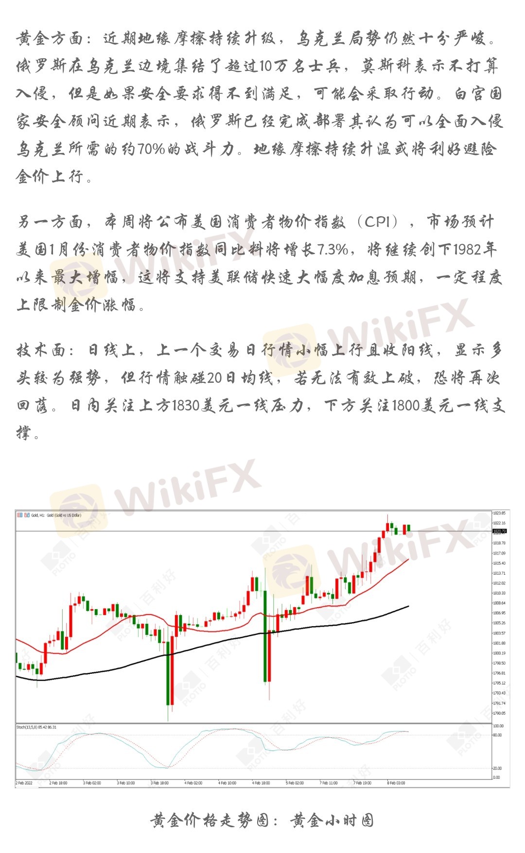 另一方面,本周将公布美国消费者物价指数(CPI),市场预计美国1月份消费者物价指数同比料将增长7.3%,将继续创下1982年以来最大增幅,这将支持美联储快速大幅度加息预期,一定程度上限制金价涨幅。
