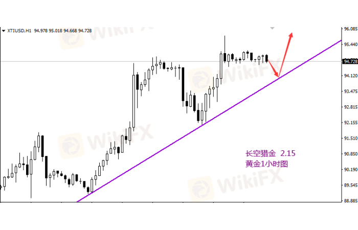 从盘面上看原油日线一直沿着均线上行,偶尔有回落但并不能影响原油的涨势,有机构预测这波原油要涨至100美金以上,目前追多肯定是不明智的,还是要回落多,短线支撑位置在94.20附近,在此位置多。