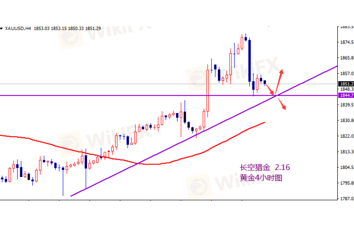 黄金昨日未能延续涨势,乌克兰局势缓和,黄金回撤至1850下方,目前下方受阻4小时中轨支撑位,重点关注此位置支撑,不破多,破位追空。