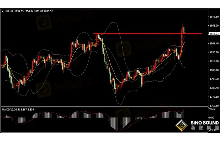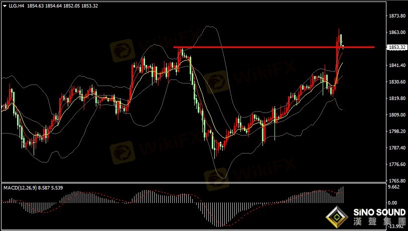 金价4小时指标看,MACD指标正动能柱逐步增加,RSI指标在超买线70位置附近徘徊。日内短线支撑位在1850整数关口附近,上方短线阻力先看1860附近。