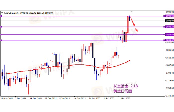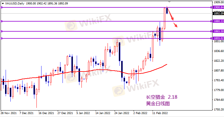日线上黄金再次收根大阳柱,但4小时也未能有效破位,上方仍然有压力,越是暴涨越要抱着恐惧心态,消息面影响大多数都会回归本质,俄乌局势继续发酵的可能性也不大,虽然上方破位1900,但依我看也只是虚破,早盘给到1900附近布局空,带5美金的止损即可。