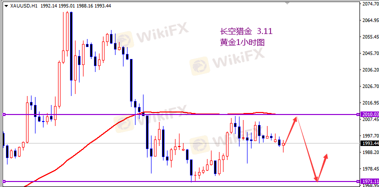 日线上看黄金昨日收了一根十字阳线,4小时级别冲高回落至中轨下方但并未有效突破,低点却不断在抬高,1小时级别上方关注2010压力,下方则继续看1970支撑,日内在此区间内高空低多。