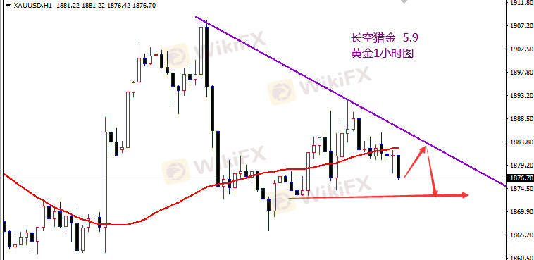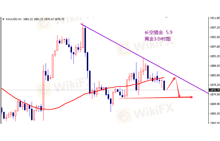 上周五非农行情未能如预期跌破1850新低,只是走了个区间震荡整理,最低1877一线,目前行情在低位运行,上方反弹受阻,日内还是以空为主。