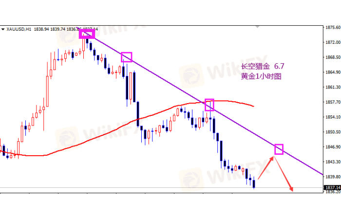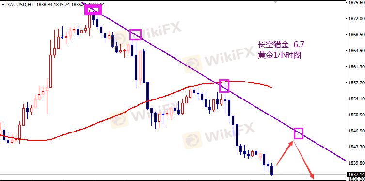 黄金昨日还是继续走低,未能向上继续突破,昨日早盘1850的多单止损了,美盘追了个空盈利也挽回了部分损失。行情回落空头占据优势,日内顺势开空。