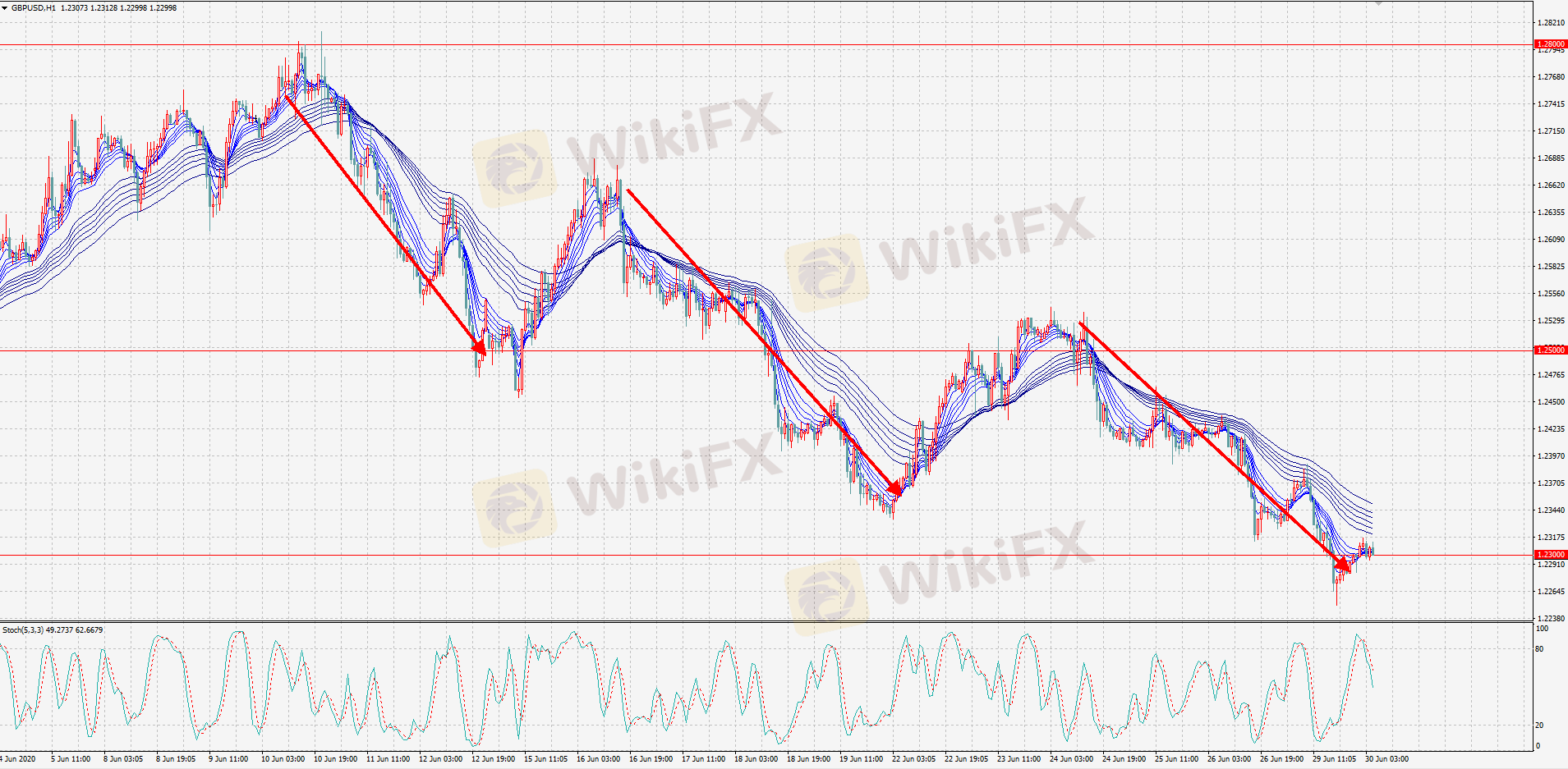 小时图看,镑美半个月以来走出三个下跌波段行情,由于镑美波动较大,回升一般也有200点,把握波动特征,注意控制仓位。目前顾比均线空头排列,长期组保持有效压力。昨晚跌至1.225形成锤子线,不过反弹力度较弱,今日亚洲早盘1.23上方小幅横盘,似有继续下行迹象。