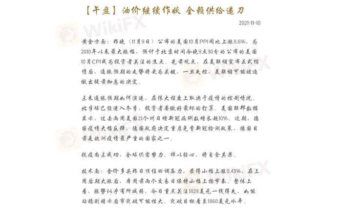 黄金方面:昨晚(11月9日)公布的美国10月PPI同比上涨8.6%,为2010年以来最大涨幅,预计于北京时间今晚9点30分的公布的美国10月CPI成为投资者关注的焦点。先前观点,在美联储宣布正式缩债后,通胀预期的走势将更为关键,一旦失控,美联储可能被迫做出提前加息的决定。