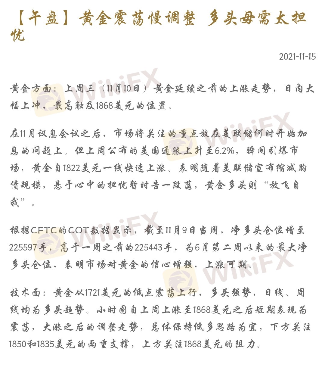 在11月议息会议之后,市场将关注的重点放在美联储何时开始加息的问题上。但上周公布的美国通胀上升至6.2%,瞬间引爆市场,黄金自1822美元一线快速上涨。表明随着美联储宣布缩减购债规模,悬于心中的担忧暂时告一段落,黄金多头则“放飞自我”。