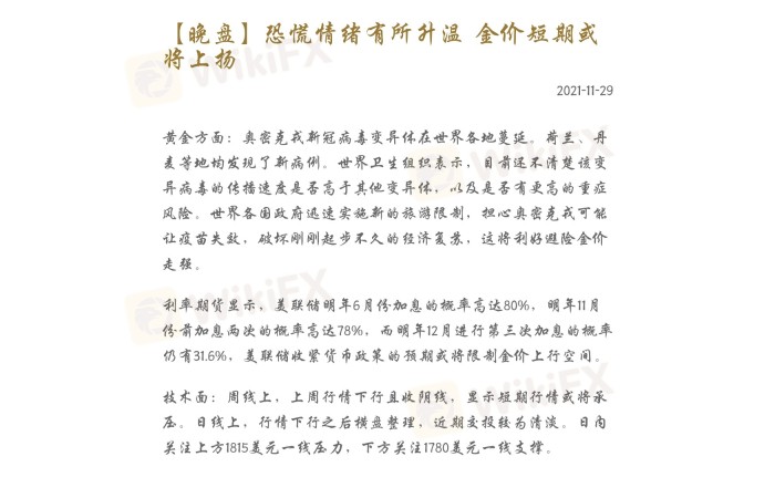 黄金方面:奥密克戎新冠病毒变异体在世界各地蔓延。荷兰、丹麦等地均发现了新病例。世界卫生组织表示,目前还不清楚该变异病毒的传播速度是否高于其他变异体,以及是否有更高的重症风险。世界各国政府迅速实施新的旅游限制,担心奥密克戎可能让疫苗失效,破坏刚刚起步不久的经济复苏,这将利好避险金价走强。