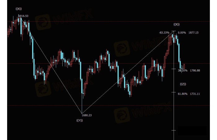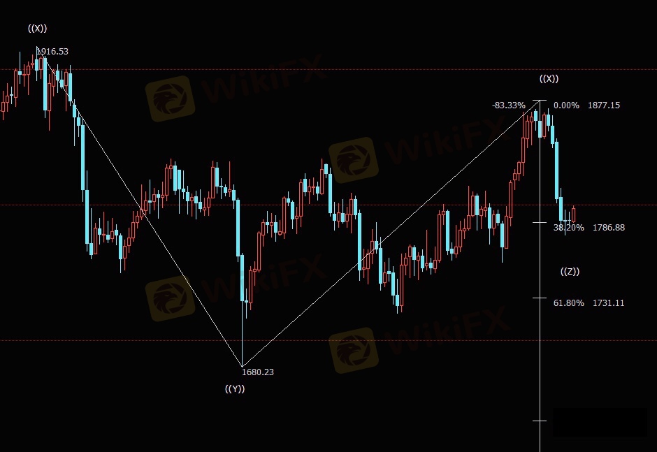 日线图上看,金价处于自1877美元开启的下行((Z))浪,已经跌破38.2%目标位1787美元,并进一步下探61.8%目标位1731美元。((Z))浪是自2075美元开启的调整IV浪的子浪。