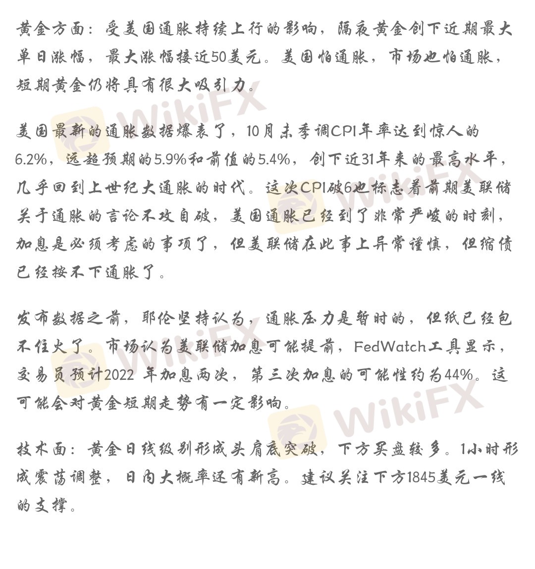 发布数据之前,耶伦坚持认为,通胀压力是暂时的,但纸已经包不住火了。市场认为美联储加息可能提前,FedWatch工具显示,交易员预计2022 年加息两次,第三次加息的可能性约为44%。这可能会对黄金短期走势有一定影响。