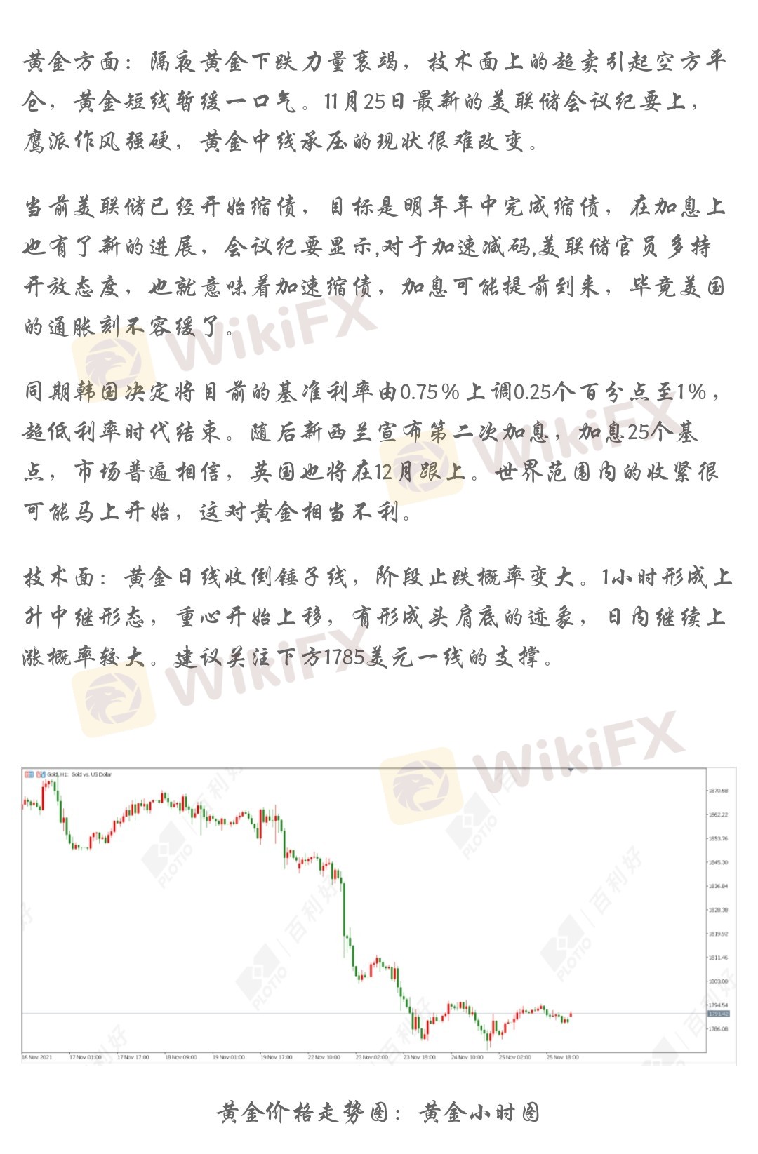 同期韩国决定将目前的基准利率由0.75%上调0.25个百分点至1%,超低利率时代结束。随后新西兰宣布第二次加息,加息25个基点,市场普遍相信,英国也将在12月跟上。世界范围内的收紧很可能马上开始,这对黄金相当不利。