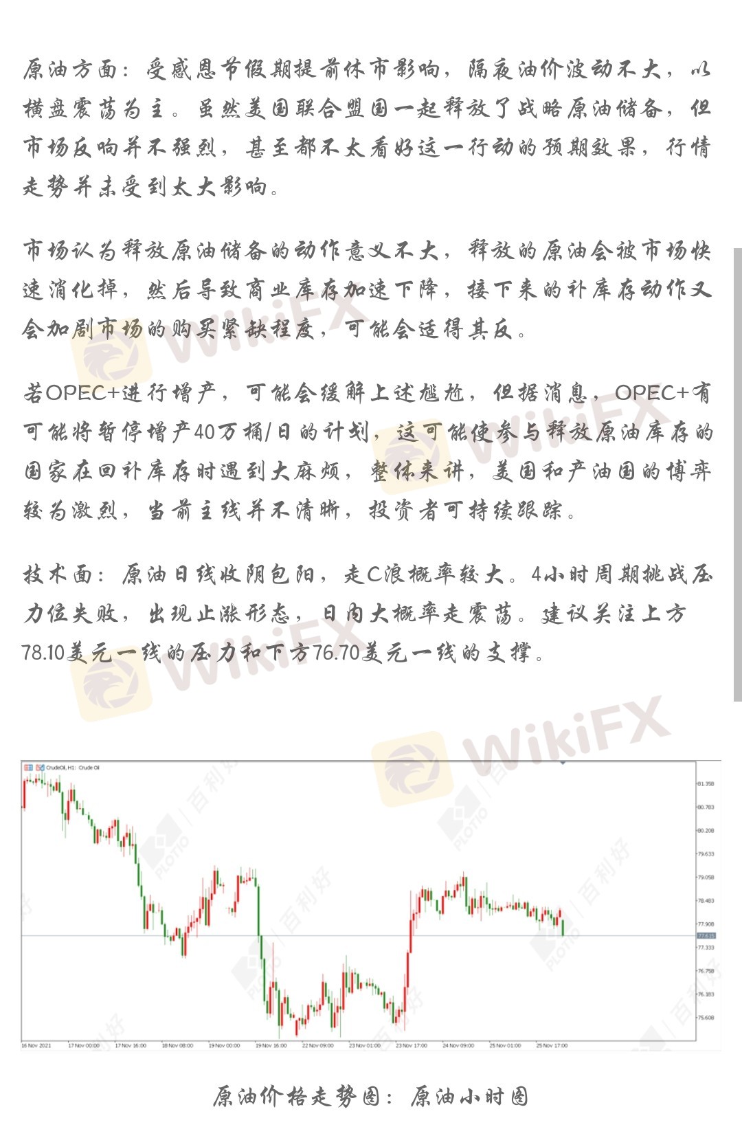 原油方面:受感恩节假期提前休市影响,隔夜油价波动不大,以横盘震荡为主。虽然美国联合盟国一起释放了战略原油储备,但市场反响并不强烈,甚至都不太看好这一行动的预期效果,行情走势并未受到太大影响。
