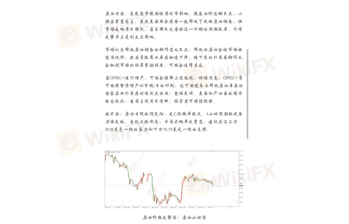 技术面:原油日线收阴包阳,走C浪概率较大。4小时周期挑战压力位失败,出现止涨形态,日内大概率走震荡。建议关注上方78.10美元一线的压力和下方76.70美元一线的支撑。