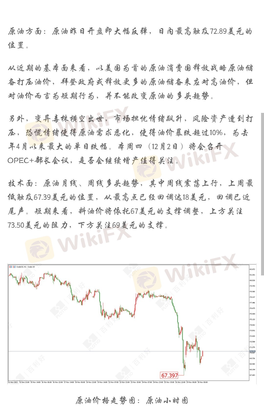原油方面:原油昨日开盘即大幅反弹,日内最高触及72.89美元的位置。