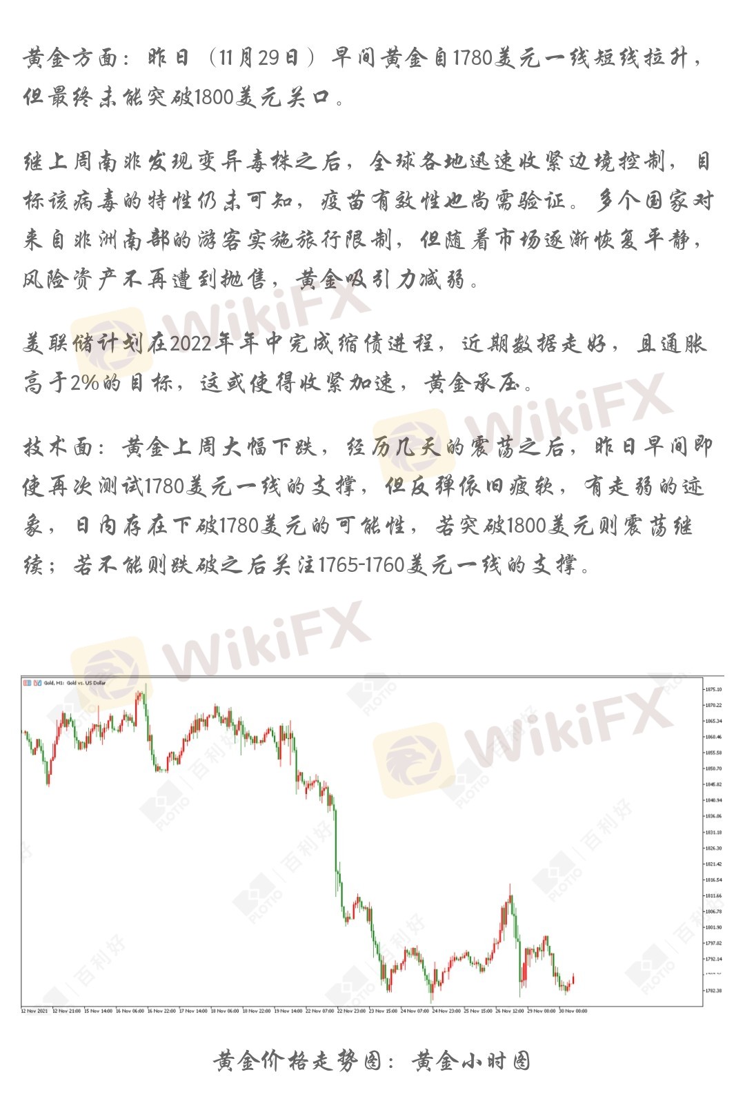 黄金方面:昨日(11月29日)早间黄金自1780美元一线短线拉升,但最终未能突破1800美元关口。