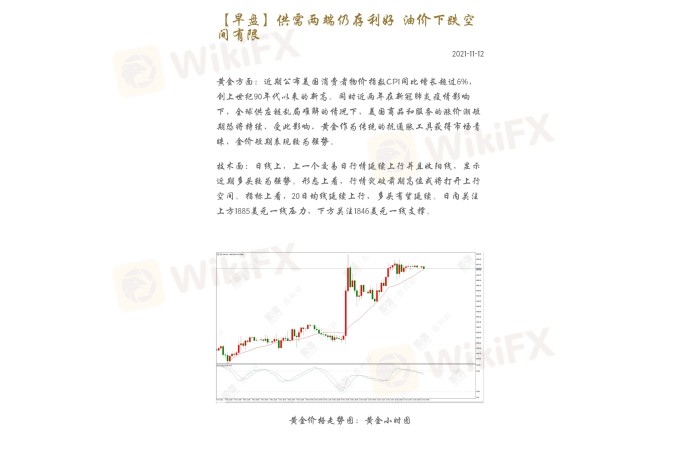 黄金方面:近期公布美国消费者物价指数CPI同比增长超过6%,创上世纪90年代以来的新高。同时近两年在新冠肺炎疫情影响下,全球供应链乱局难解的情况下,美国商品和服务的涨价潮短期恐将持续,受此影响,黄金作为传统的抗通胀工具获得市场青睐,金价短期表现较为强势。