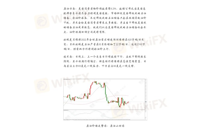 技术面:日线上,上一个交易日行情延续下行,且收下影线较长阴线,显示短期行情偏空,但总体仍将维持在高位宽幅震荡。日内关注上方83美元一线压力,下方关注80美元一线支撑。