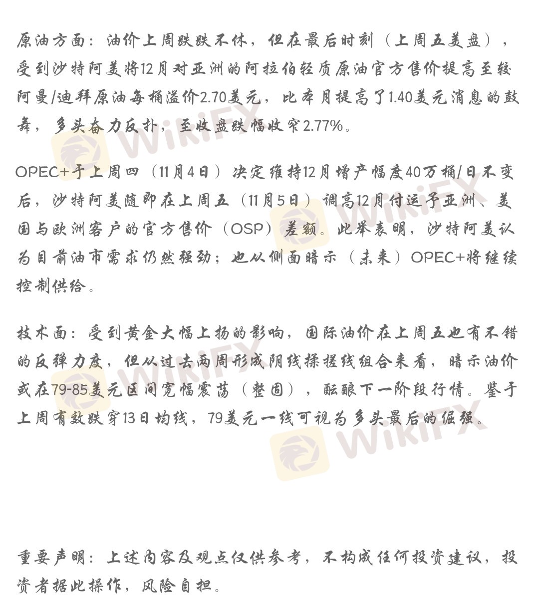 原油方面:油价上周跌跌不休,但在最后时刻(上周五美盘),受到沙特阿美将12月对亚洲的阿拉伯轻质原油官方售价提高至较阿曼/迪拜原油每桶溢价2.70美元,比本月提高了1.40美元消息的鼓舞,多头奋力反扑,至收盘跌幅收窄2.77%。