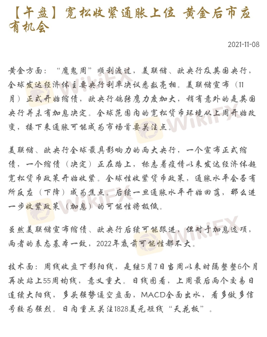 【午盘】宽松收紧通胀上位 黄金后市应有机会