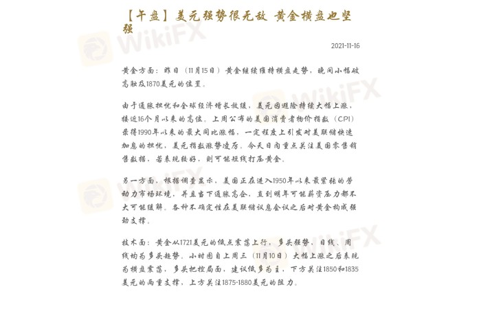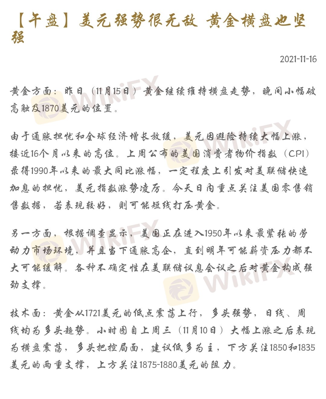 黄金方面:昨日(11月15日)黄金继续维持横盘走势,晚间小幅破高触及1870美元的位置。