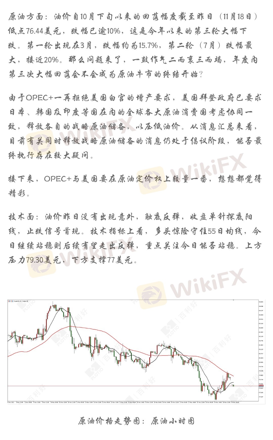 技术面:油价昨日没有出现意外,触底反弹,收盘单针探底阳线,止跌信号首现。技术指标上看,多头惊险守住55日均线,今日继续站稳则后续有望走出反弹,重点关注今日能否站稳。上方压力79.30美元,下方支撑77美元。