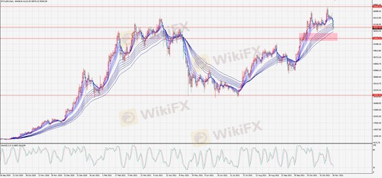 日线图,比特币站稳三万关口后涨势如虹,不足三个月翻倍。一周前,比特币创历史新高,但是冲击69000失败,调整至今。目前价格跌进顾比均线长期组,有望继续调整至前方密集成交55000一带。短期建议耐心等待回踩50000-55000区间的买入机会。免责声明:以上为NCE分析师个人观点,仅供参考,并不代表NCE对于投资者的任何直接操作建议,投资者据此入市风险自负。NCE官网:https://www.ncemarkets.com