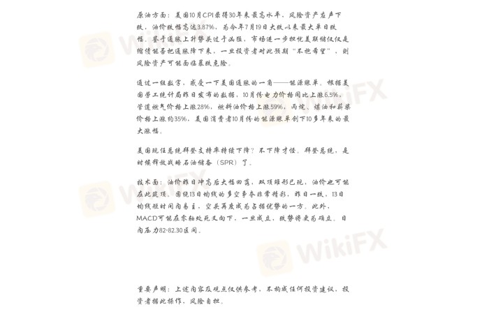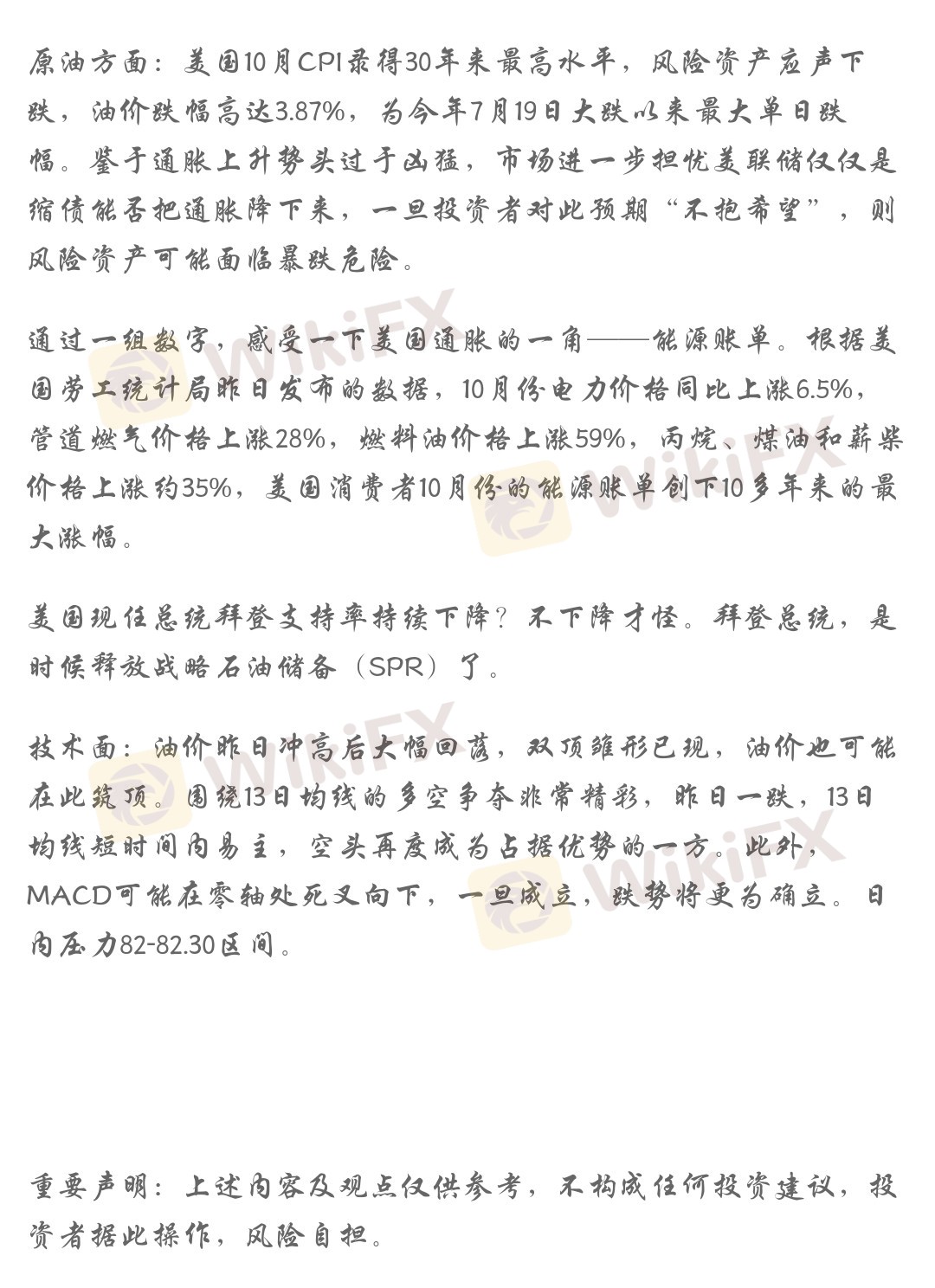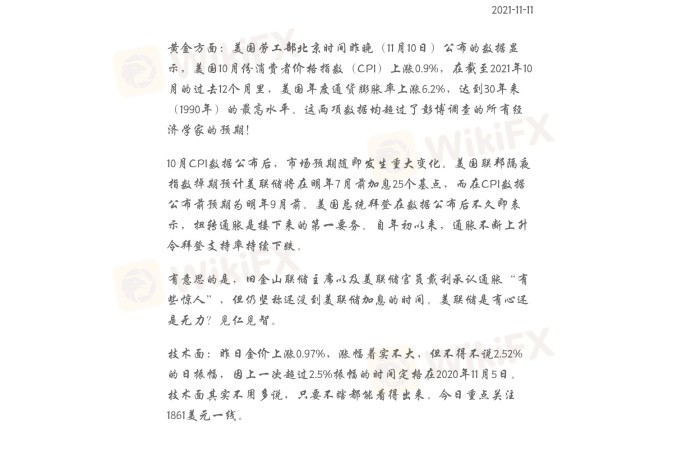 黄金方面:美国劳工部北京时间昨晚(11月10日)公布的数据显示,美国10月份消费者价格指数(CPI)上涨0.9%,在截至2021年10月的过去12个月里,美国年度通货膨胀率上涨6.2%,达到30年来(1990年)的最高水平。这两项数据均超过了彭博调查的所有经济学家的预期!