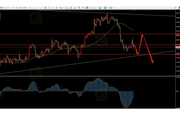 这样的走势预示着本轮反弹大概率结束,大家期盼的1900或成泡影。周线两连阴重新跌回60周线下方。反弹高点不断下降,大周期在走以2075高点开始的下降三角形整理,底部在1680,未来大概率会跌破。短期以1680和1721连线的上升趋势线上方,没跌破之前依然是震荡行情,趋势线支撑在1765附近。从上周五走势来看黄金短期仍然会延续下跌,到达趋势线支撑上方形成4小时底背离或有较大级别反弹,上方目标1800-1820。