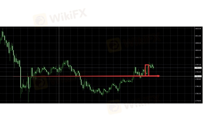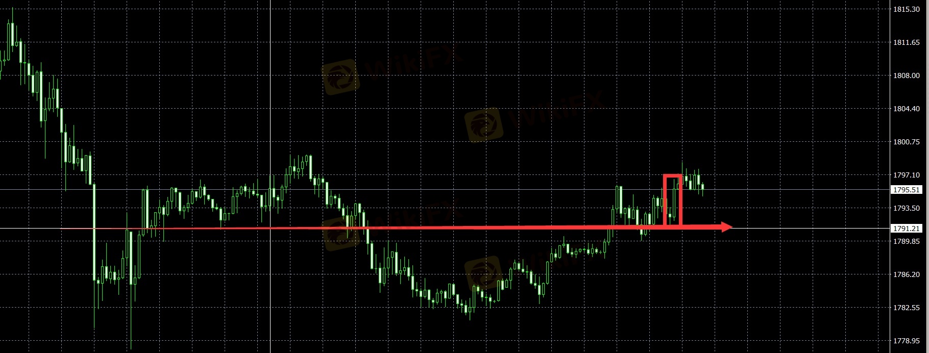 下午黄金1792-94建议做空。 1790下不去。测试价格几次之后再次小时线阳包阴!受疫情消息面影响!避险走强! 测试失败 止损离场!