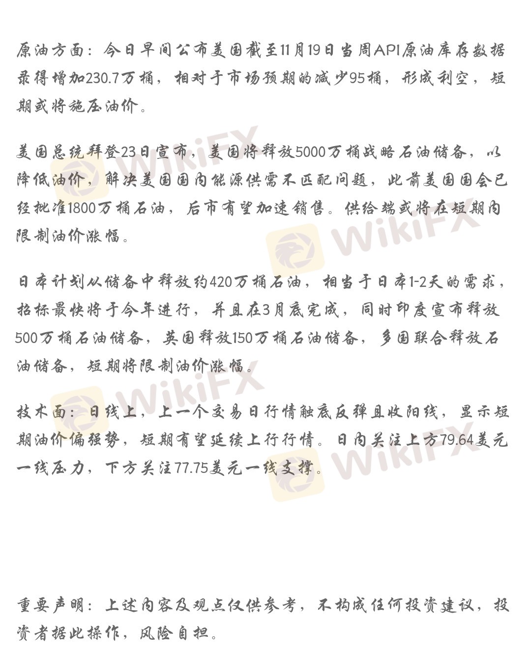 美国总统拜登23日宣布,美国将释放5000万桶战略石油储备,以降低油价,解决美国国内能源供需不匹配问题,此前美国国会已经批准1800万桶石油,后市有望加速销售。供给端或将在短期内限制油价涨幅。