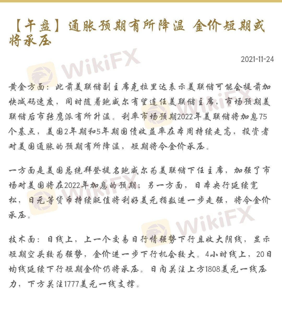 【午盘】通胀预期有所降温 金价短期或将承压