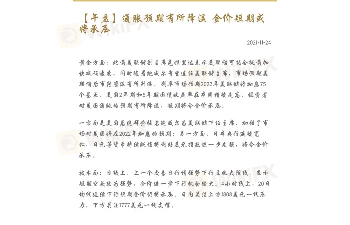 一方面是美国总统拜登提名鲍威尔为美联储下任主席,加强了市场对美国将在2022年加息的预期;另一方面,日本央行延续宽松,日元等货币持续贬值将利好美元指数进一步走强,将令金价承压。