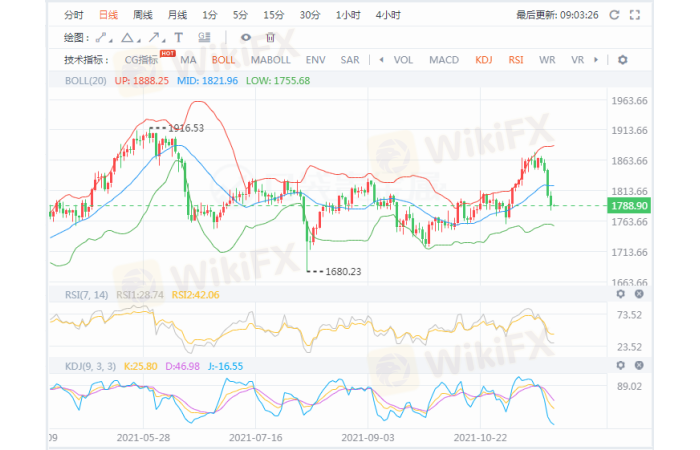 昨日黄金市场延续下行过程,早盘行情开盘在1805的位置后行情先反弹,日线最高触及到了1812.7的位置后行情展开回落过程,日线最低给到了1781.5的位置后行情受到支撑整理,日线最终收线在了1788.9的位置后行情以一根下影线稍长于上影线的大阴线收线。