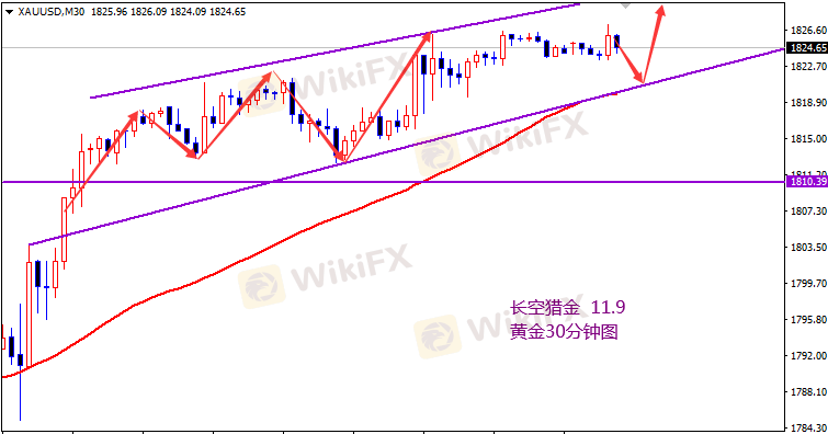 黄金站上1810压力后未见回撤直接上行至1825一线,我们预测的小目标又到了,接下来的大目标就是1840,日内回撤给到1820直接多。