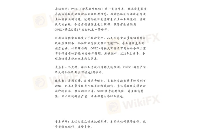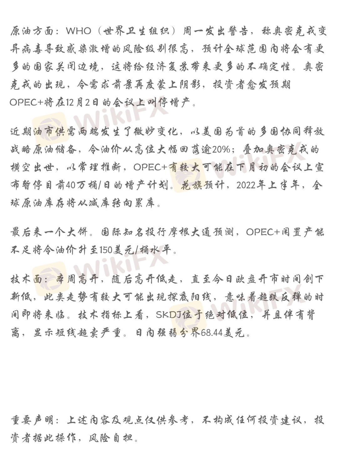 原油方面:WHO(世界卫生组织)周一发出警告,称奥密克戎变异病毒导致感染激增的风险级别很高,预计全球范围内将会有更多的国家关闭边境,这将给经济复苏带来更多的不确定性。奥密克戎的出现,令需求前景再度蒙上阴影,投资者愈发预期OPEC+将在12月2日的会议上叫停增产。
