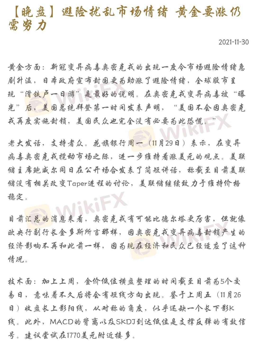 黄金方面:新冠变异病毒奥密克戎的出现一度令市场避险情绪急剧升温,日本政府宣布封国更为助涨了避险情绪,全球股市呈现“滑铁卢一日游”是最好的说明。在奥密克戎变异病毒被“曝光”后,美国总统拜登第一时间发表声明,“美国不会因奥密克戎再度实施封锁,美国民众也完全没有必要为此恐慌。”