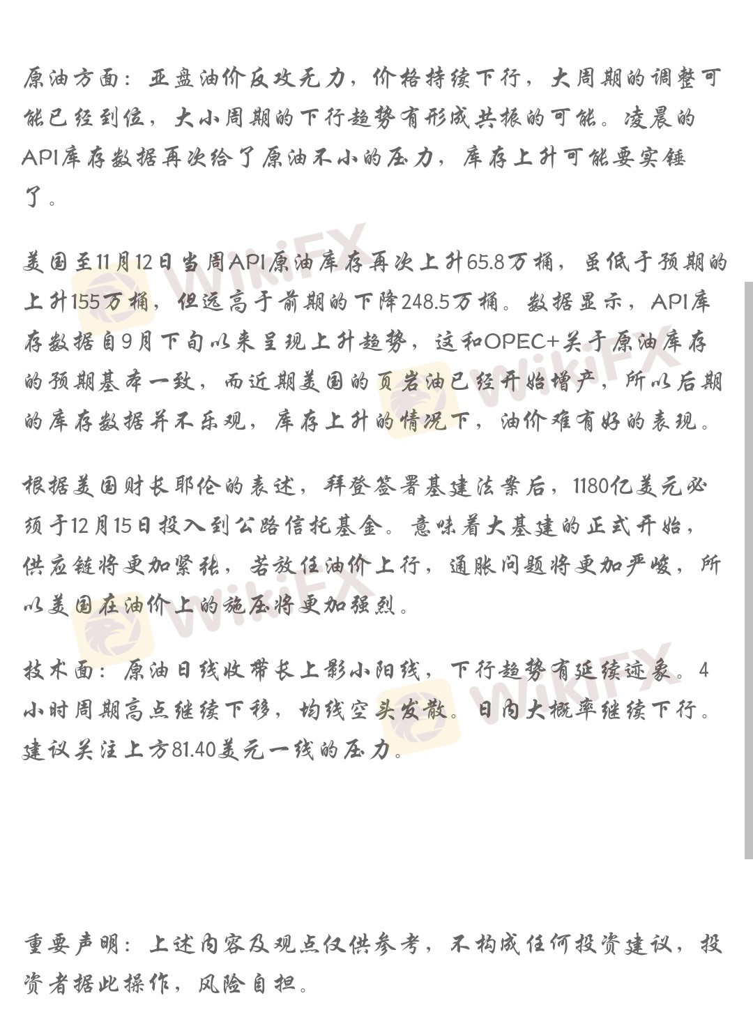 美国至11月12日当周API原油库存再次上升65.8万桶,虽低于预期的上升155万桶,但远高于前期的下降248.5万桶。数据显示,API库存数据自9月下旬以来呈现上升趋势,这和OPEC+关于原油库存的预期基本一致,而近期美国的页岩油已经开始增产,所以后期的库存数据并不乐观,库存上升的情况下,油价难有好的表现。