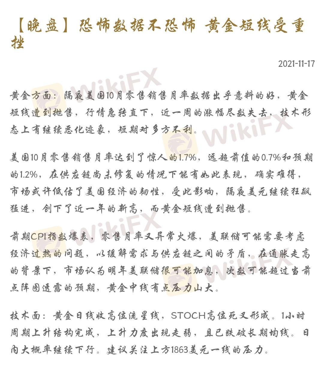 美国10月零售销售月率达到了惊人的1.7%,远超前值的0.7%和预期的1.2%,在供应链尚未修复的情况下能有如此表现,确实难得,市场或许低估了美国经济的韧性,受此影响,隔夜美元继续狂飙猛进,创下了近一年的新高,而黄金短线遭到抛售。